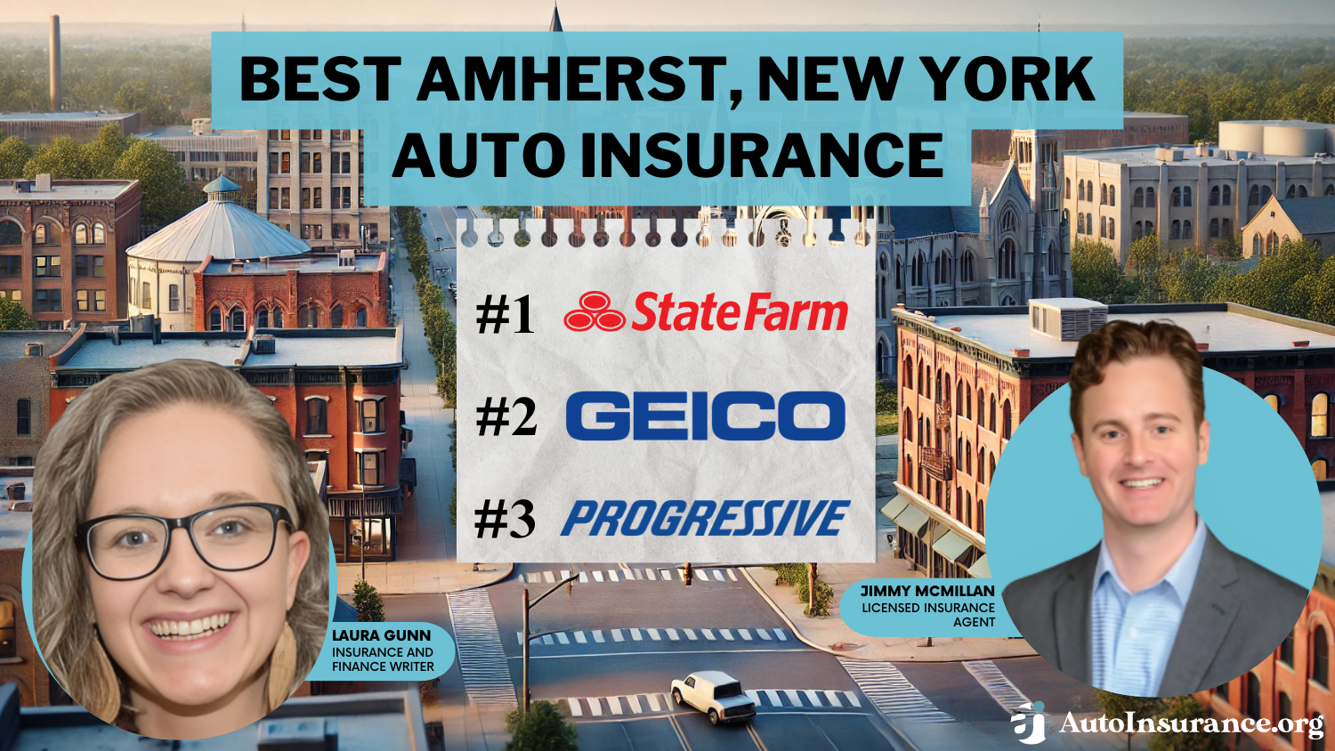 For the best Amherst, New York auto insurance, State Farm, Geico, and Progressive offer excellent choices that offer rates starting at $115 per month. They provide affordable rates, reliable coverage with broad discounts, and offer flexible options like accident forgiveness for Amherst residents.