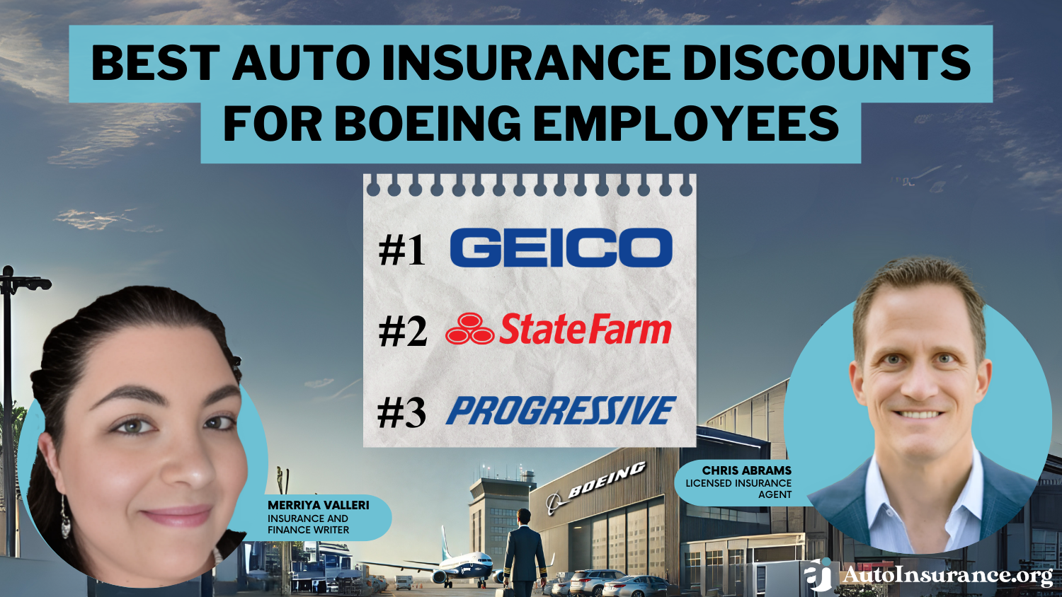 Geico offers the best auto insurance discounts for Boeing employees, with savings of up to 25%. State Farm and Progressive also provide top discounts, helping employees lower their premiums. Boeing employees can benefit from a range of options, making it easy to find auto insurance discounts for Boeing employees.