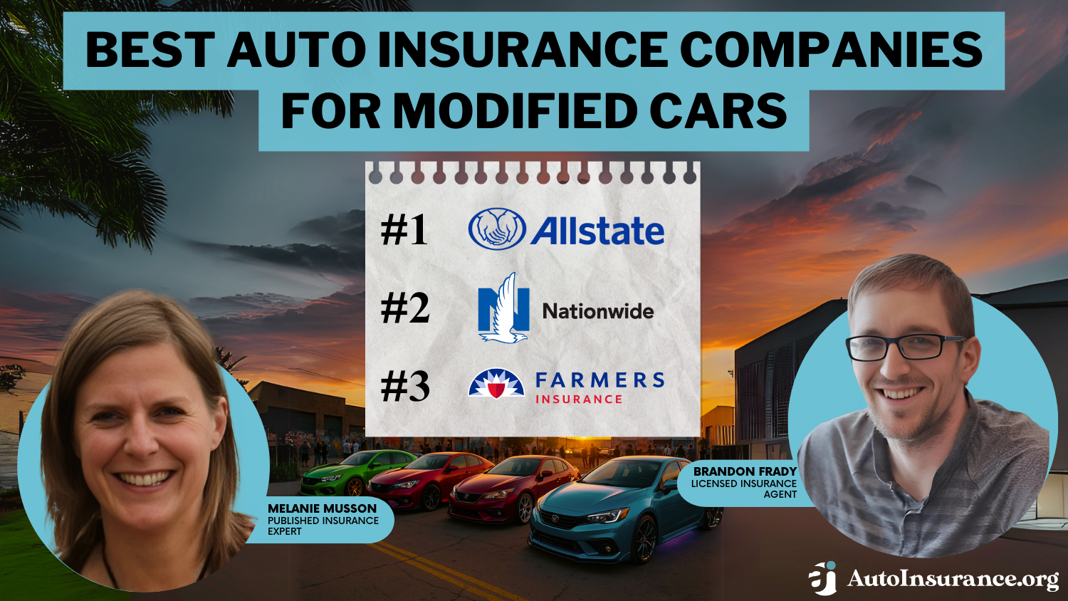 State Farm, Progressive, and Allstate are the best auto insurance companies for modified cars. Minimum modified car insurance costs an average of $80/mo at State Farm. Rates will vary based on the cost of modifications made to your vehicle, your driving record, and other important factors.