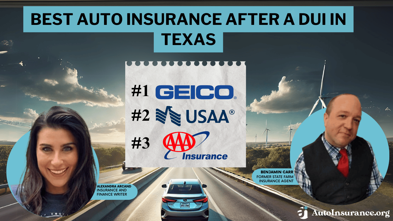 Get the best auto insurance after a DUI in Texas from Geico, USAA, or AAA. Affordable DUI auto insurance starts as low as $34 a month for military members.
