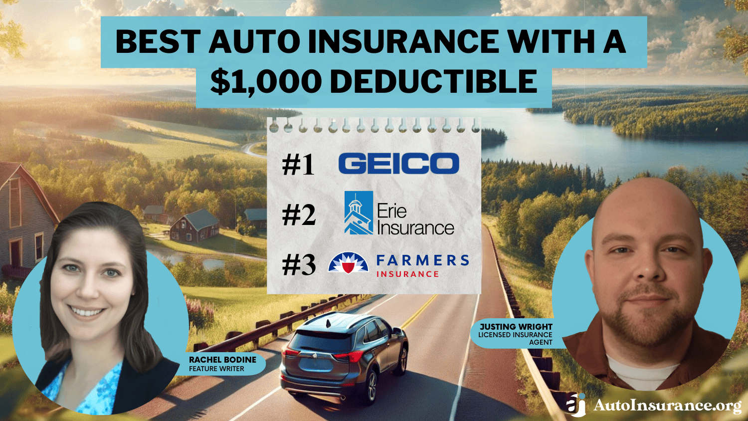 Geico, Erie, and Farmers have the best auto insurance with a $1,000 deductible, starting at $90 monthly. Geico stands out for rewarding safe drivers with $100 yearly deductible reductions. Erie Rate Lock prevents rate increases after an accident, while Farmers provides savings for teachers and nurses.