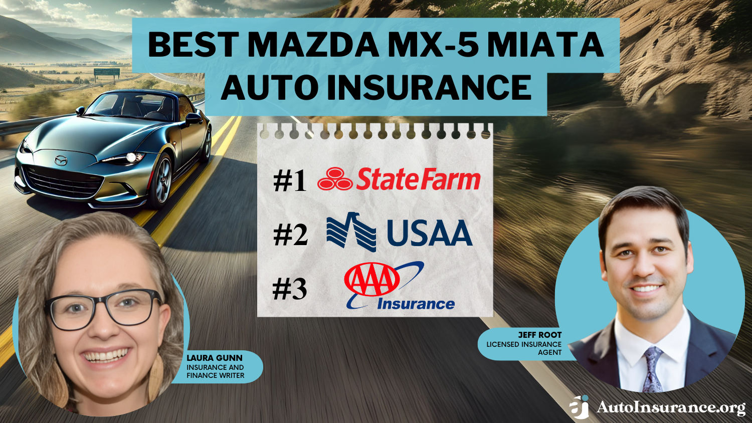 State Farm, USAA, and AAA stand out as the top providers for the best Mazda MX-5 Miata auto insurance, offering competitive rates and tailored to Miata owners.