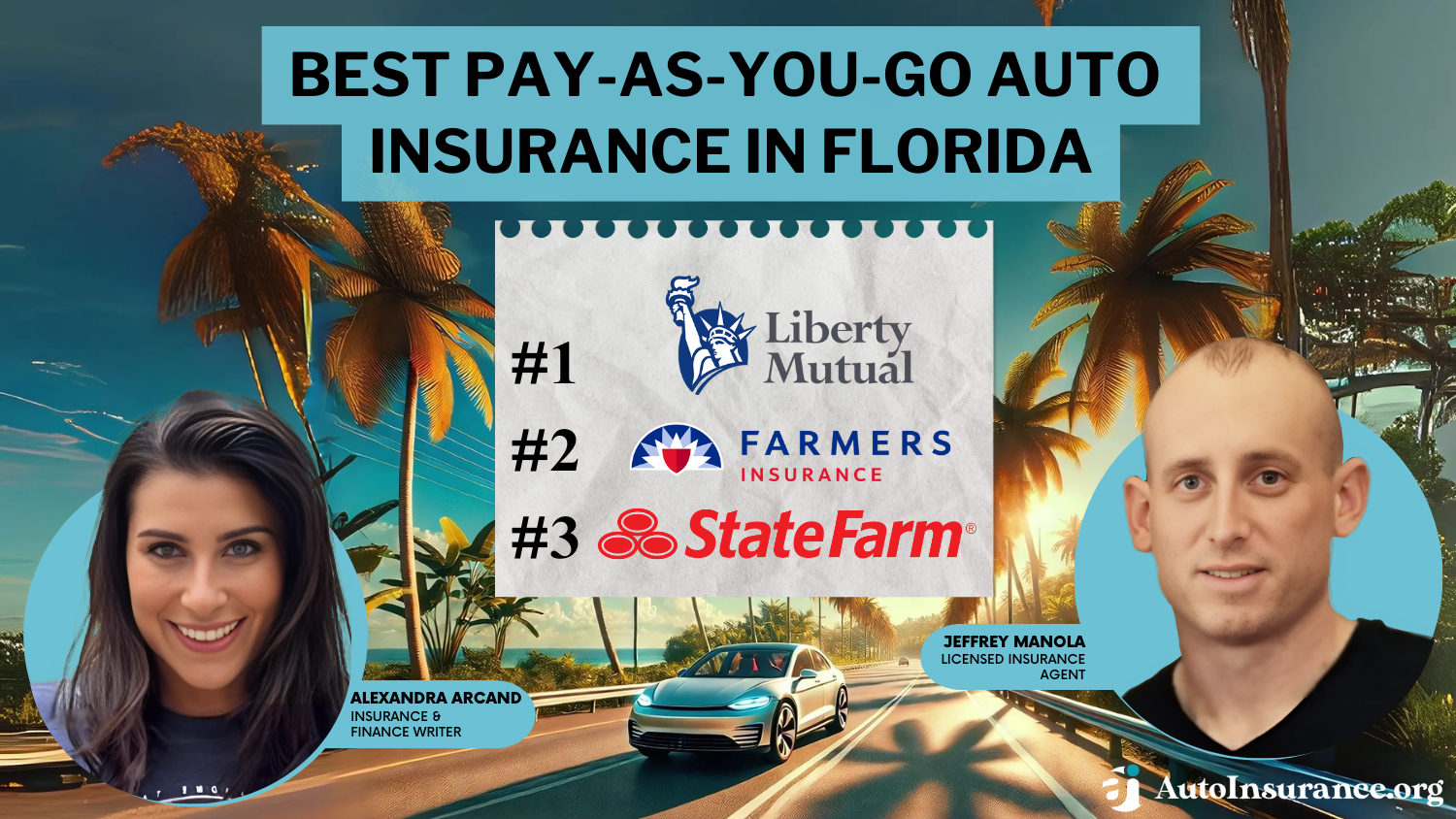 Liberty Mutual, Farmers, and State Farm offer the best pay-as-you-go auto insurance in Florida at just $44/mo. Pay-as-you-drive insurance companies provide customized coverage based on driving habits, mileage, and budget. Auto insurance costs in Florida can be reduced with discounts for low mileage and safe driving.