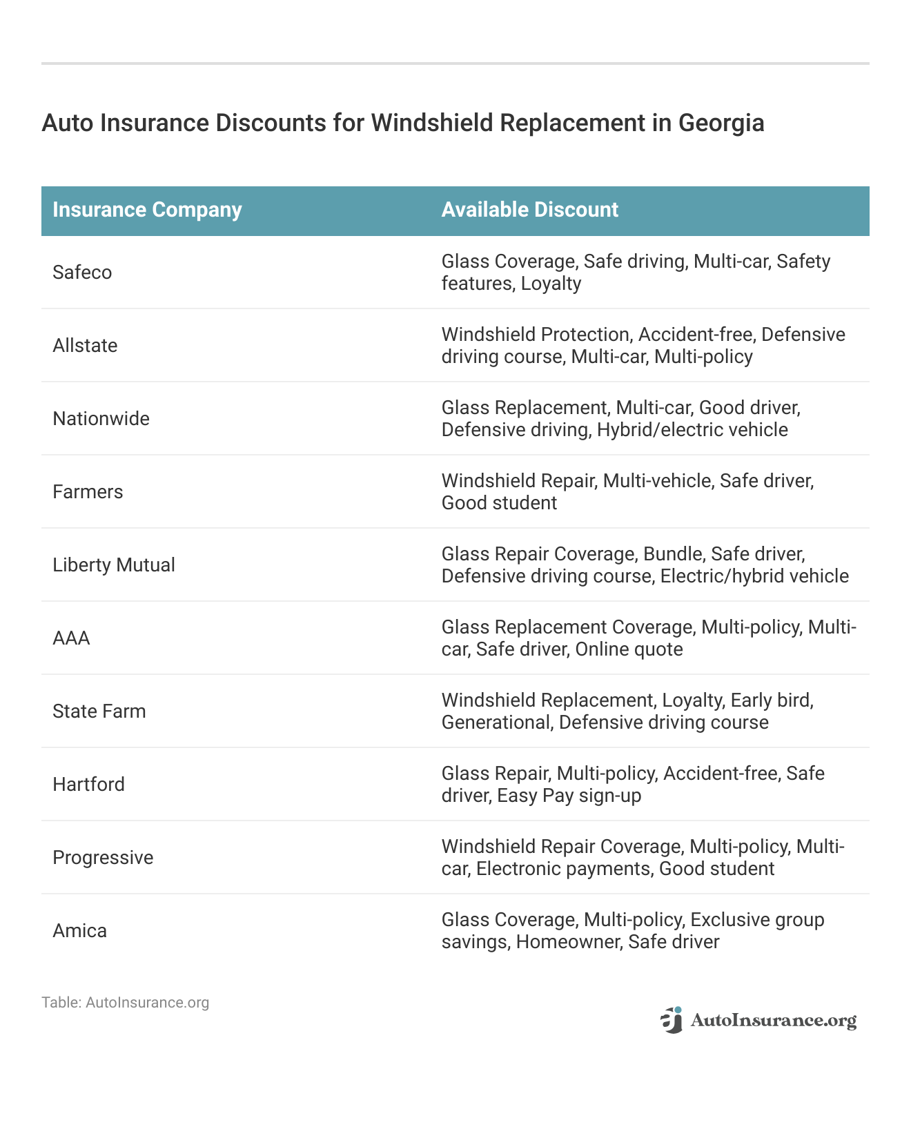 The starting monthly rate for windshield replacement coverage offered by Safeco in Georgia is $198. Enter your ZIP code now to start comparing.