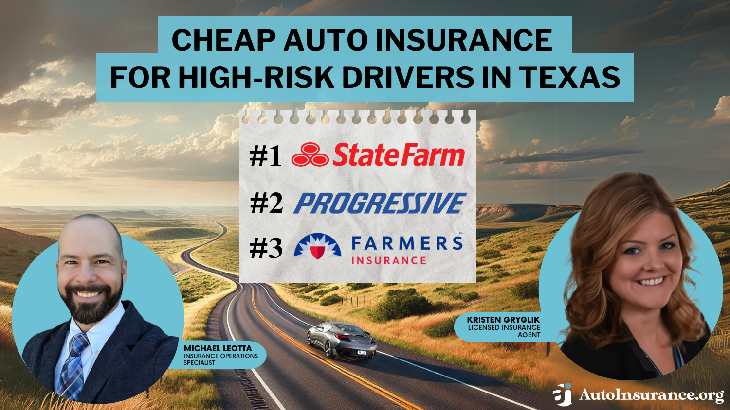 State Farm, Progressive, and Farmers have cheap auto insurance for high-risk drivers in Texas. State Farm has the cheapest rates on average, starting at $86 per month.