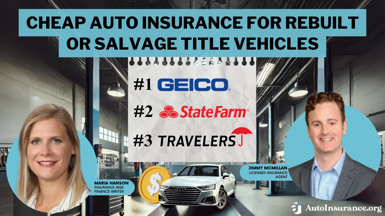 Geico, State Farm, and Travelers are our top picks for cheap auto insurance for rebuilt or salvage title vehicles. With rates starting at just $32/month, finding affordable salvage title insurance is usually easy with these companies. However, it can be difficult to purchase full coverage for a rebuilt title car.