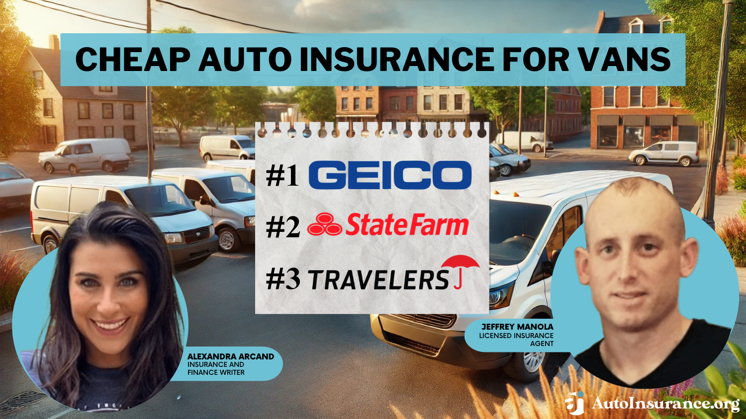 The top companies for cheap auto insurance for vans are Geico, State Farm, and Travelers, with rates starting at $43 per month for minimum coverage. Whether you need personal van insurance or commercial cargo van coverage, you can find it at these companies with their generous discounts and coverage options.