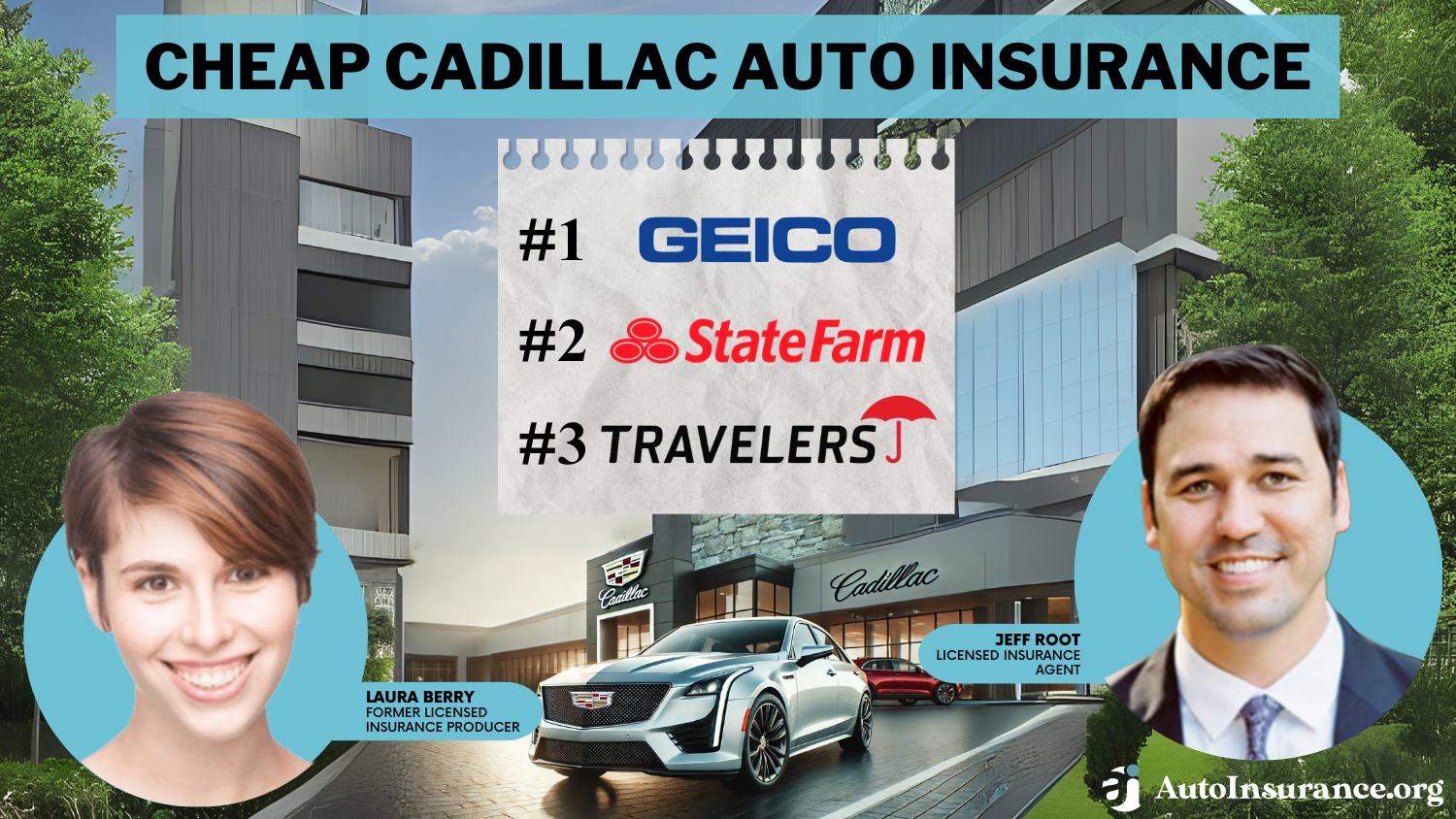 The top picks for cheap Cadillac auto insurance are Geico, State Farm, and Travelers. While Cadillacs are considered a luxury brand and therefore cost more to insure, Geico has minimum coverage rates that average only $43/mo. The cheapest Cadillac insurance companies also offer plenty of discount opportunities.