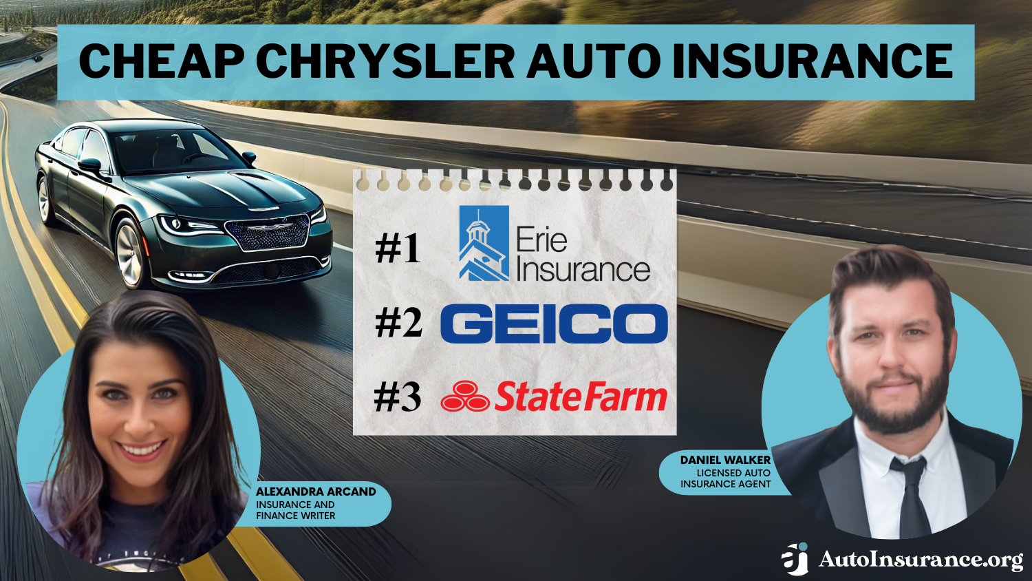 18,155 reviewsErie, Geico, and State Farm are the top choices for cheap Chrysler auto insurance.