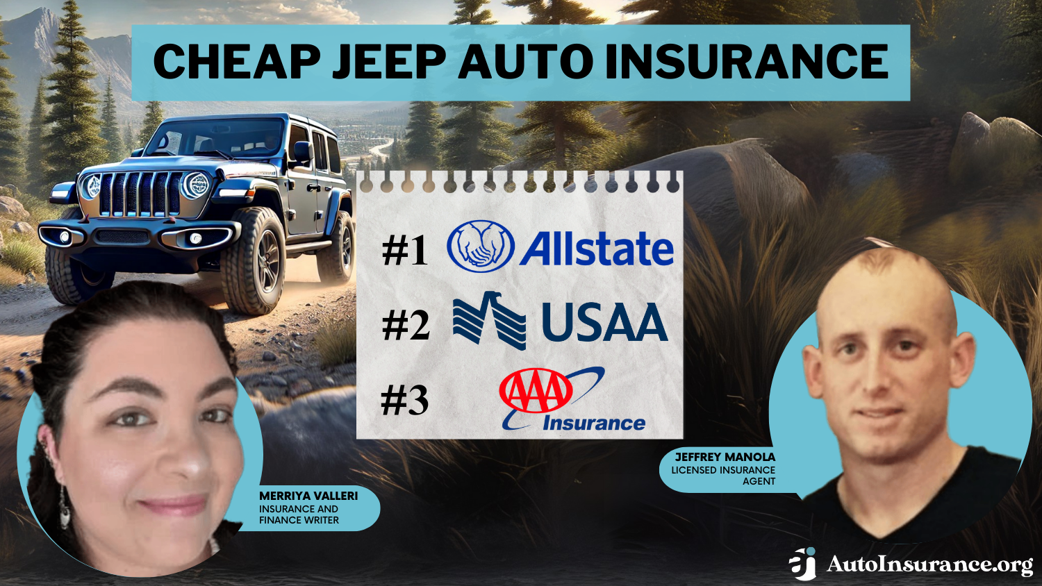 3,027 reviewsThe top companies for cheap Jeep auto insurance are Allstate, USAA, and AAA, especially for drivers looking for coverage options.