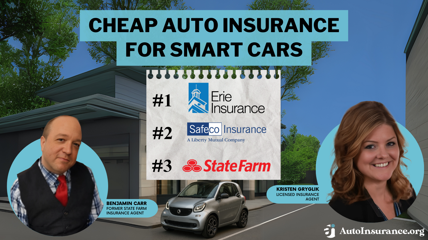 The top picks for cheap auto insurance for smart cars are Erie, Safeco, and State Farm, with rates starting at $40/mo, ensuring affordability, compliance with state laws, and protection. Below, you can compare discounts, coverages, and the cost of insurance on smart cars from top providers near you.