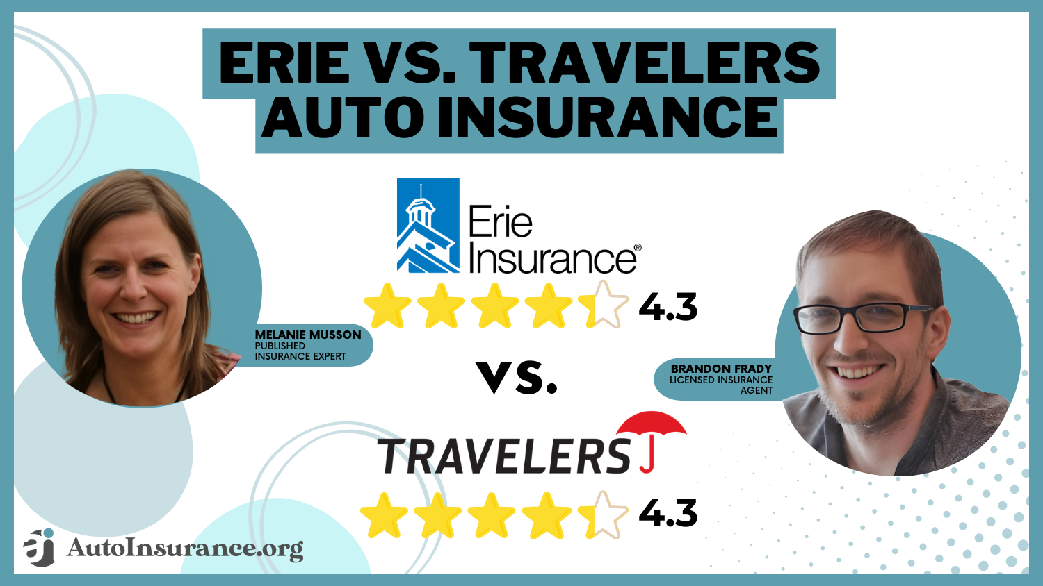Our review of Erie vs. Travelers auto insurance found Erie has lower rates starting at $32 per month with Rate Lock and fewer complaints. Meanwhile, Travelers starts at $53 per month, and stands out for its 30% IntelliDrive discount, better A++ A.M. Best rating, and robust coverage add-ons.