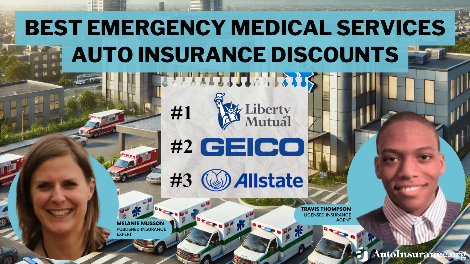 Liberty Mutual, Geico, and Allstate offer the best EMS auto insurance discounts, where you can save up to 15%. You might qualify for an emergency medical services (EMS) employee auto insurance discount from certain companies.