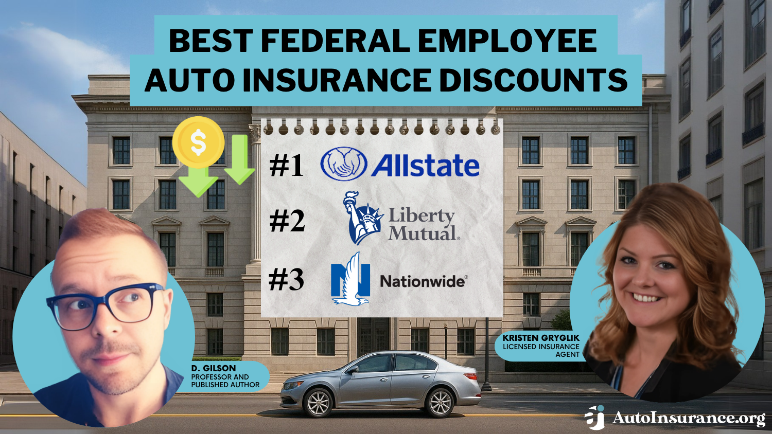 Allstate and Liberty Mutual offer the best federal employee auto insurance discounts with a 10% savings for most government employees. If you are a current or retired government or military employee, you and your family can easily qualify for a federal employee discount with most top providers.