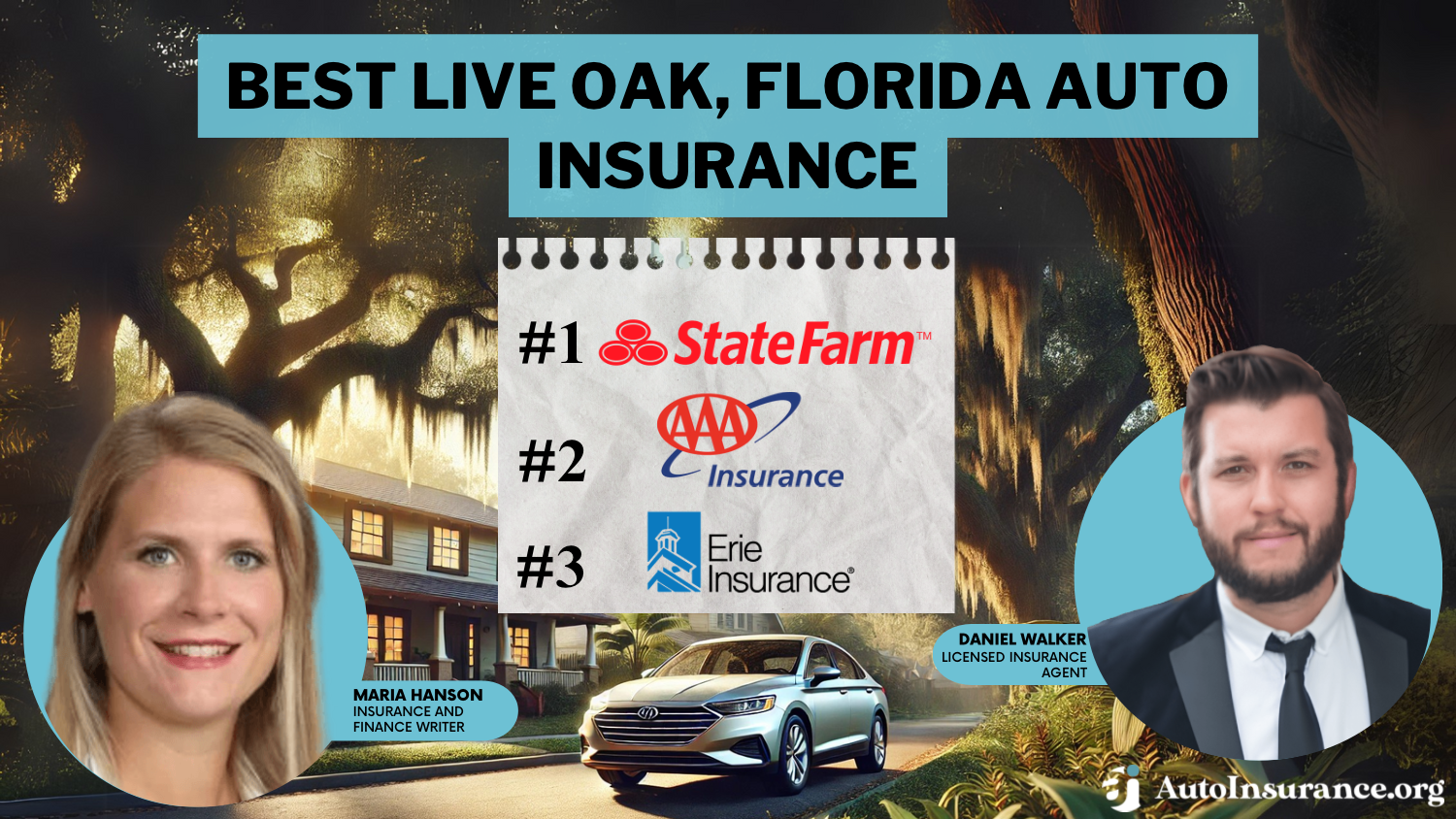 The best options for best Live Oak, Florida auto insurance are State Farm, AAA, and Erie, with State Farm offering the most competitive rates at $48 per month.
