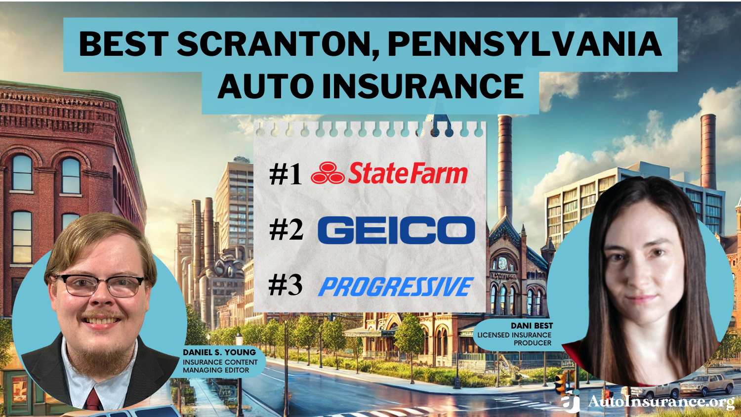 To get the best Scranton, Pennsylvania auto insurance, compare our three best companies, State Farm, Geico, and Progressive, with rates beginning at $29 per month. Take local factors into account to choose a policy that fits your budget and offers the coverage needed for drivers in Scranton, Pennsylvania.